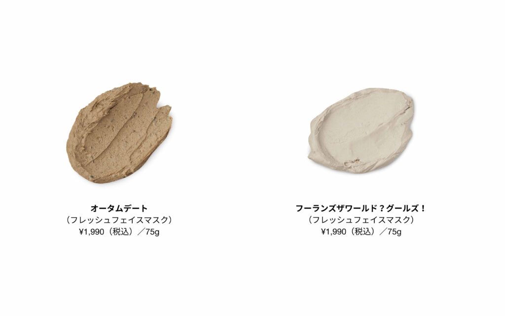 LUSHの人気アイテム「フレッシュフェイスマスク」は、まさに“つくりたて”をお肌に届ける特別なプロダクト。野菜やフルーツ、クレイ、エッセンシャルオイルなどをシンプルな製法でハンドメイド。合成保存料を使わず、製造から28日以内に使い切る“鮮度命”のマスクです。冷蔵庫で保管し、使う直前に取り出して肌へたっぷり伸ばすと、ひんやりとした感触が心までリフレッシュ。10〜15分置いた後、円を描くようにやさしく洗い流すだけで、まるで秋風を浴びたような柔らかな肌に整います。