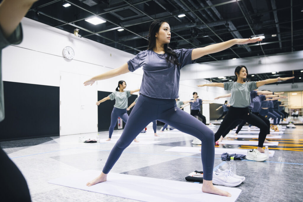 「筋トレは通っているのですが、ヨガは初めて!」と話すのは、モデル・タレントの石垣花蓮さん。少々、真剣な表情ですが「戦士のポーズ」もスムーズにこなします。
