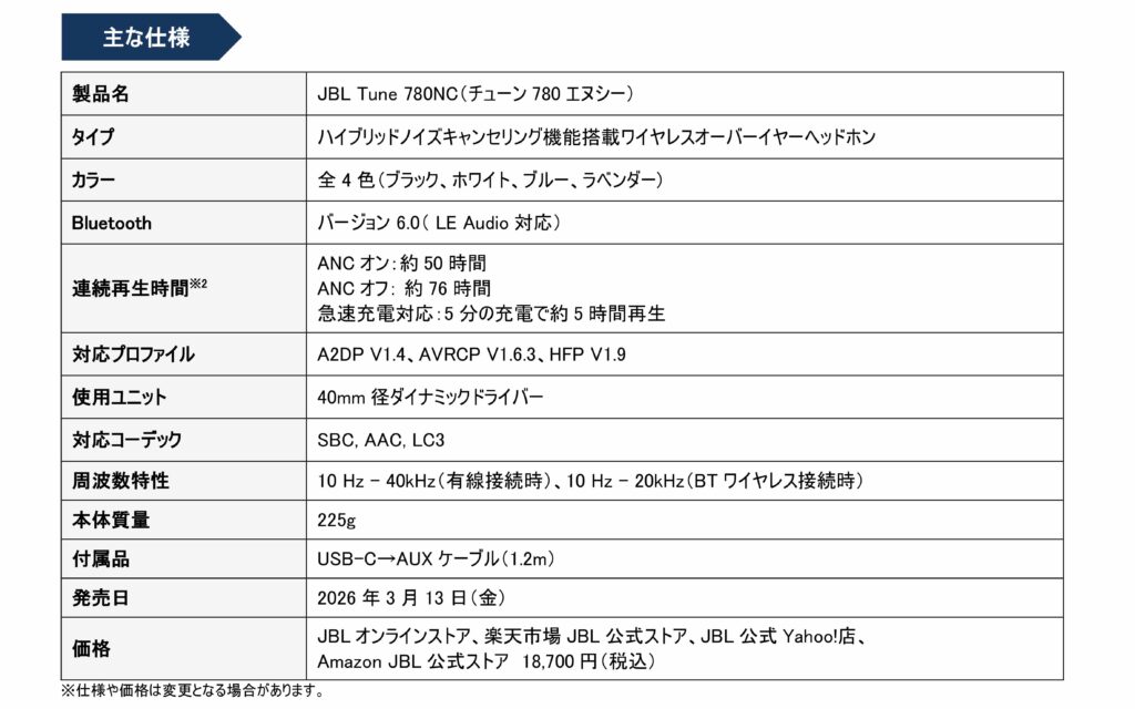 オーディオ好きなら一度は耳にしたことがあるであろう、アメリカ・カリフォルニア発の世界的オーディオブランド「JBL」。日本国内ではワイヤレススピーカー8年連続販売台数No.1という実績を誇るそのJBLから、待望の新作ワイヤレスオーバーイヤーヘッドホン「JBL Tune 780NC」が2026年3月13日(金)より限定発売されます。